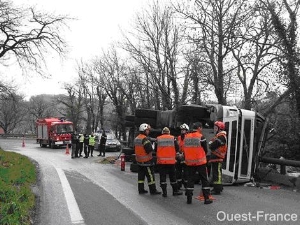 Le gros coup de la balade s'est produit au Bas-Pont-Scorff lors du retour vers Ploemeur. On venait d'attaquer la montée vers Pont-Scorff quand, après le 2ème virage, on entend derrière nous un gros fracas. On se retourne et on aperçoit un camion citerne couché dans le virage sur le rail de sécurité à gauche. On fait aussitôt demi-tour pour rejoindre le lieu de l'accident. C'est un camion transportant du lait. Le balan de la marchandise dans la citerne a dû faire perdre le contrôle du véhicule au chauffeur. Un automobiliste est déjà auprès du chauffeur et appelle les secours sur son portable. Des ambulanciers sont rapidement sur place. Pendant ce temps tous les gars du club se mobilisent pour sécuriser le lieu de l'accident et se chargent de régler la circulation car on ne peut circuler que sur une file. Inutile de dire que la chaussée est devenue glissante, le lait de la citerne se déversant sur la route jusqu'au pont en bas.