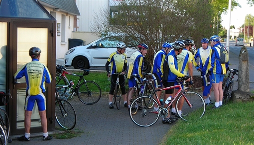 Double peine pour les cyclos du club, car non content d'avoir dormi une heure de moins, notre rendez-vous à La Longère est avancé d'une demi-heure, soit 8h30. Eh oui, pour faire du vélo, il ne faut pas craindre de rogner sur son sommeil. Debout les gars réveillez-vous ! Il va falloir en mettre un coup ..... (air bien connu d'Hugues Aufray).